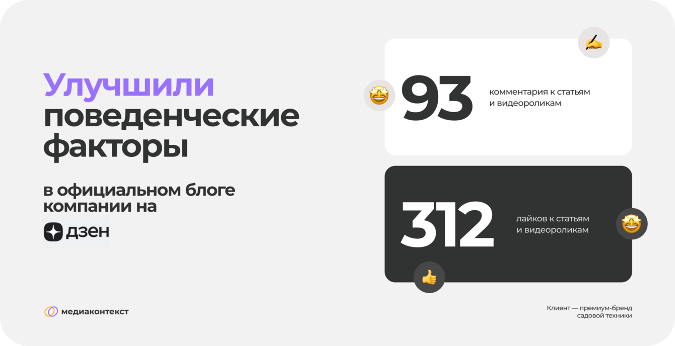 Улучшили поведенческие факторы в официальном блоге компании на Дзене: разместили 93 комментария и 312 лайков к статьям и видеороликам.