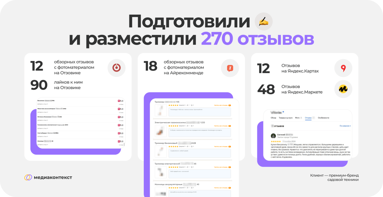 Подготовили и разместили 270 отзывов о продукции компании с тем посылом, что и товары отечественного бренда могут быть достойного качества и не уступать зарубежным. Из общего количества: