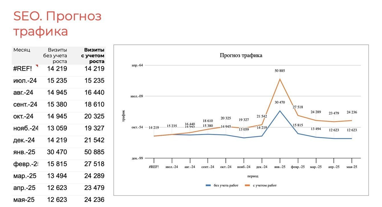 Кроме того, мы сделали медиаплан по SEO. Хоть оптимизация сайта и не очень быстрая процедура, все равно прогнозный результат показал довольно оптимистичный сценарий прироста органического трафика.