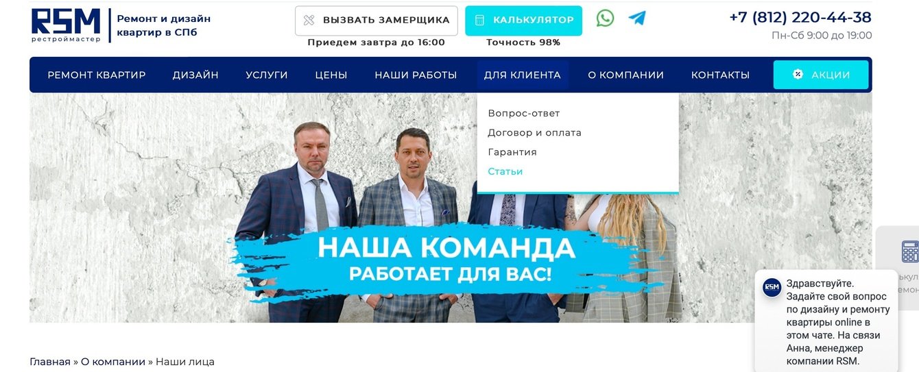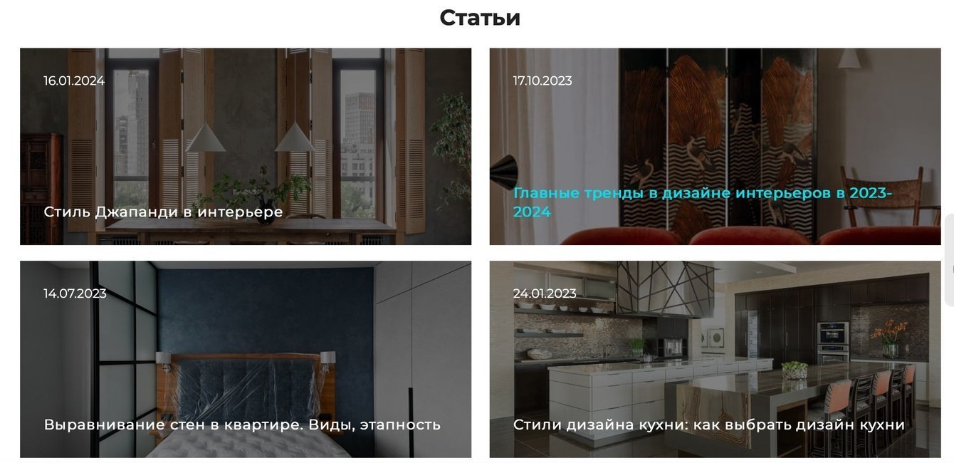 Блог: вели блога на сайте с публикацией статей о ремонте, советах по дизайну, кейсах из практики.
