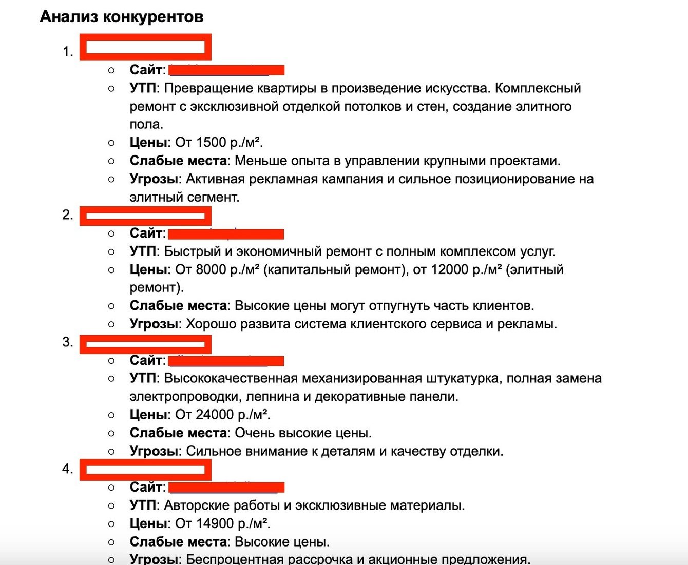 Как и всегда мы начали с анализа конкурентов: мы выделили 10 ключевых игроков, определили их слабые места и угрозы.