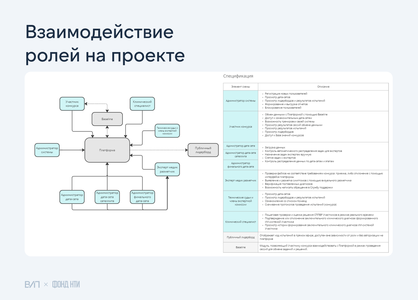 Продумали функциональные требования и спроектировали личные кабинеты для 8 ролей пользователей (участник, эксперт-медик, администратор и тд).