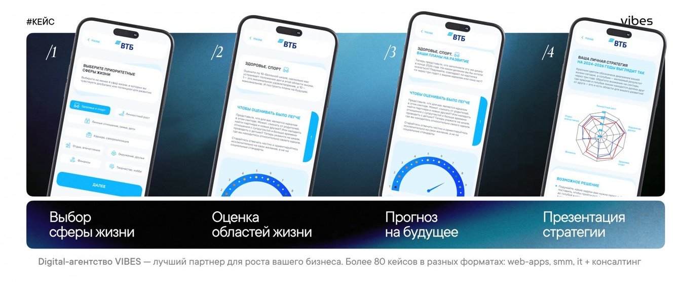 Представители ВТБ придумали идею вовлечь широкую аудиторию в презентацию стратегии развития банка на 3 года. Для этого решили разработать интерактивное приложение, доступное каждому. Основная цель — помочь составить личную стратегию развития. За реализацией обратились к нам.