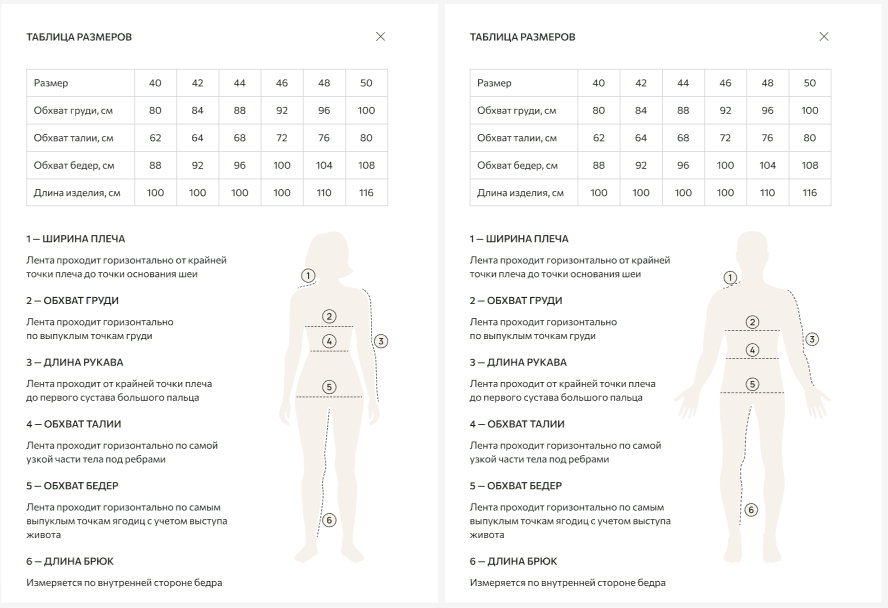 Чтобы уменьшить количество возвратов товаров на старте, в модальное окно таблицы размеров мы добавили шпаргалку по снятию мерок. Так покупатель будет сразу заказывать нужный размер.
