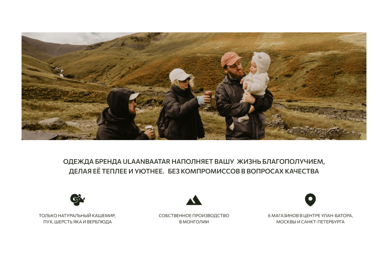 Чтобы поддержать фирстиль бренда, мы использовали бежевые, темно-зеленые оттенки, фото природы и семьи, чтобы передать атмосферу благополучия. Это слово стало центральным инсайтом — именно благополучия данная ЦА желает своим самым близким людям. В нем отражается все тепло и мягкость одежды ULAANBAATAR.