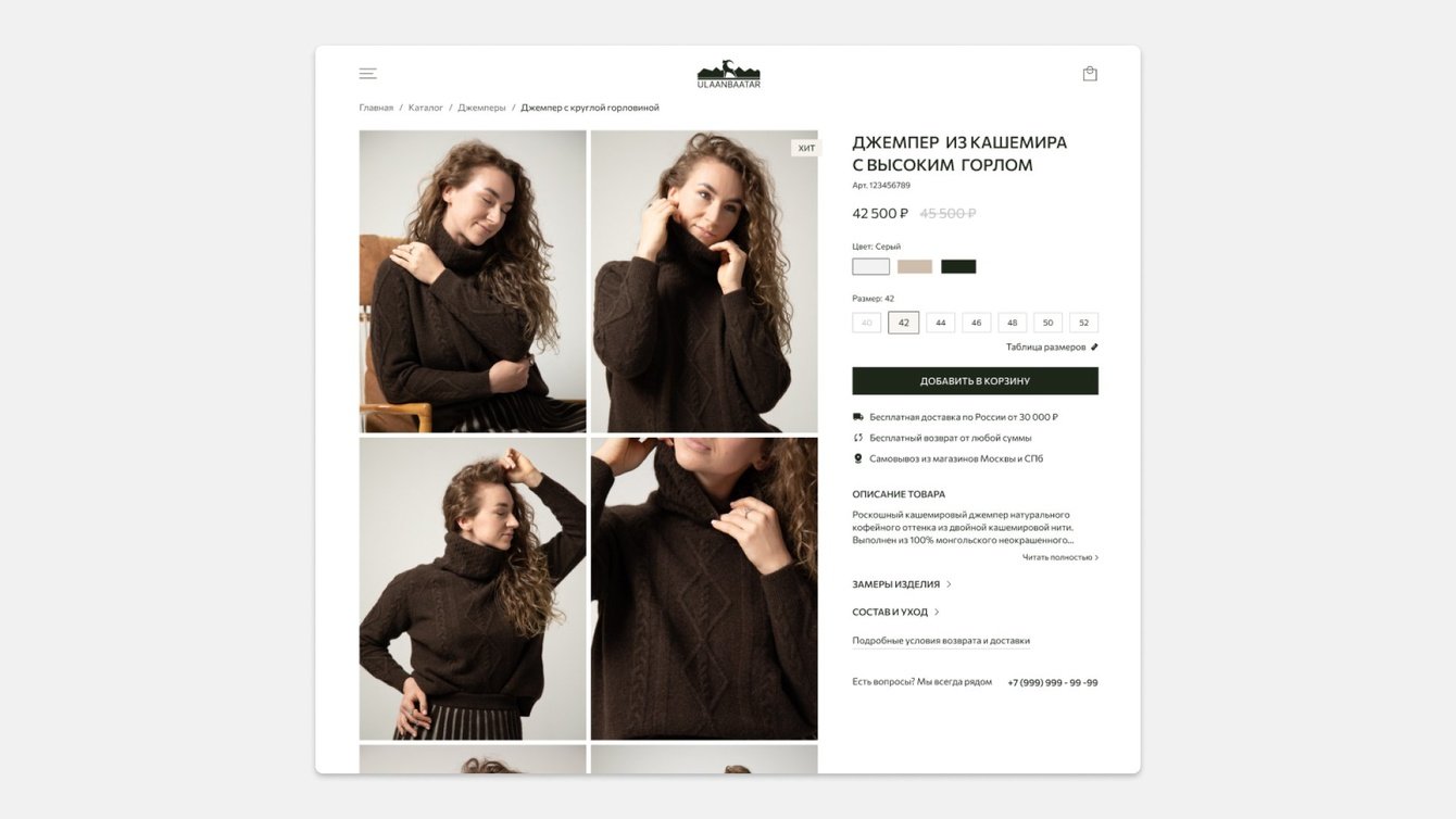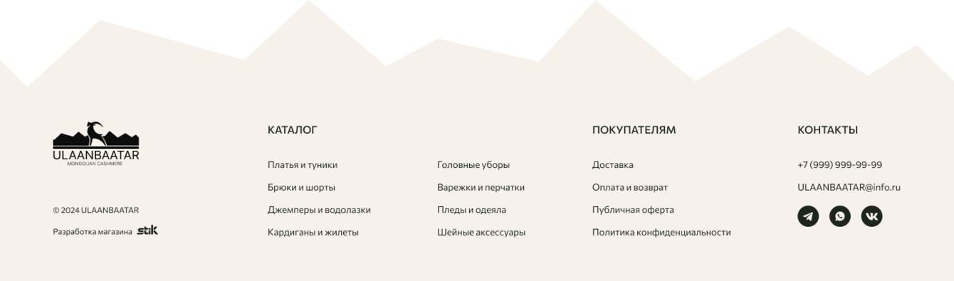 Но даже в минималистичном интернет-магазине мы смогли найти, где проявить особенность бренда и как выделиться на фоне конкурентов. Футер главной страницы сделали в виде гор, которые повторяют очертания логотипа и отсылают к Монголии, где и собирается кашемир.
