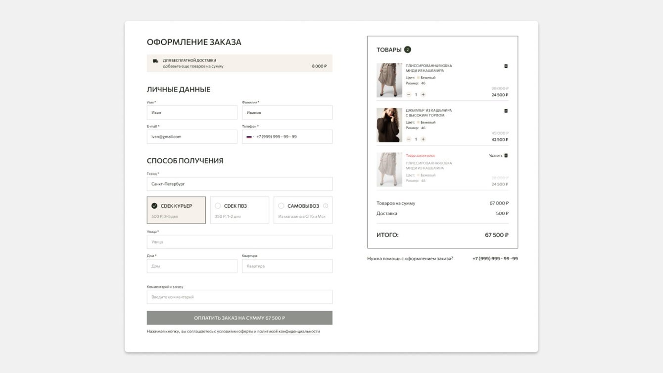 Добавили пункт «Самовывоз из магазинов Москвы и СПб». Для покупателя это значит, что у бренда есть физические магазины, одежду можно померить вживую — это работает как дополнительное преимущество и побуждение к покупке.