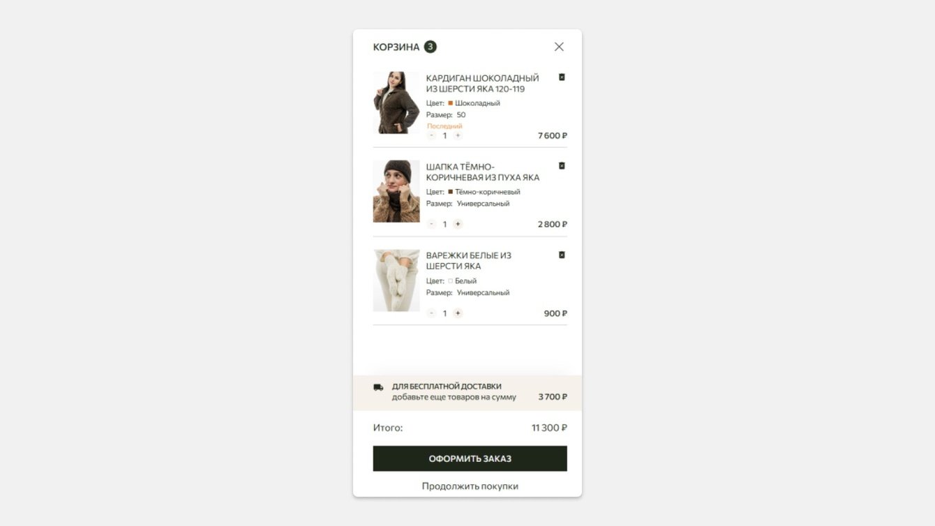 Чтобы увеличить чек клиента, в модальном окне корзины мы добавили подсказку о том, какую сумму осталось набрать до бесплатной доставки. Этот блок появляется, когда пользователь добавляет товары из в каталога и в самой карточке товара. Подсказка работает как мотивация добрать нужную сумму.