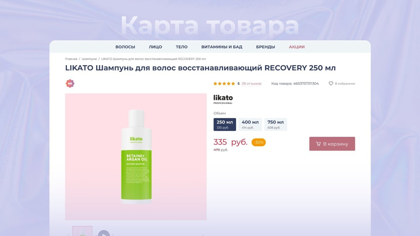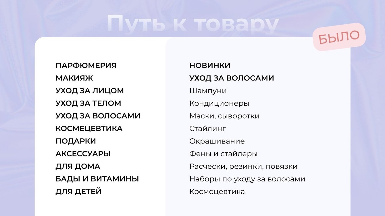 Интернет-магазин — инструмент генерации продаж, поэтому еще одним пунктом, на который мы обратили особое внимание, стала разработка каталога товаров. Мы проанализировали каталоги сайтов-конкурентов, вот так выглядит раздел «Волосы» в большинстве крупных магазинов косметики: