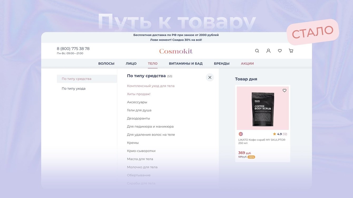 Всего за 12 недель мы разработали и запустили интернет-магазин Cosmokit. Помимо поставленных задач мы параллельно реализовали большое количество правок от клиента, а также добавили дополнительные опции, доставка до ПВЗ СДЭК.