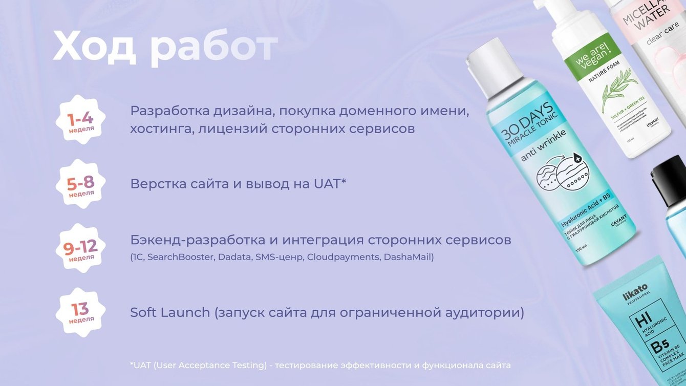 Клиенту было важно разработать сайт за короткий срок — 12 недель, поэтому мы оптимизировали план работ и разделили его на несколько этапов: