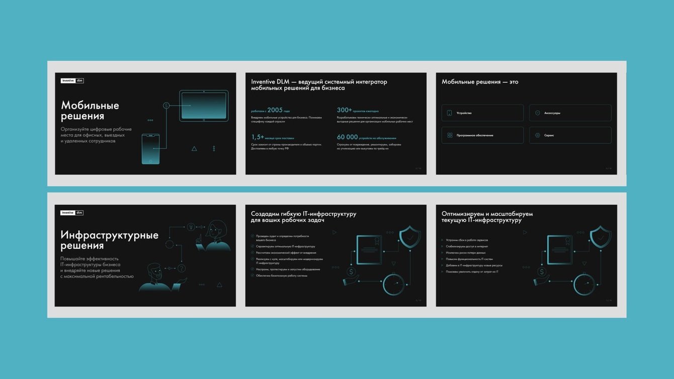 Inventive DLM — ведущий системный интегратор и импортер IT-оборудования и мобильных решений для бизнеса. Компания помогает своим клиентам оптимизировать рабочие процессы и улучшать коммуникации: поставляет и устанавливает технику, ремонтирует ее в сервисных центрах, устанавливает программное обеспечение.