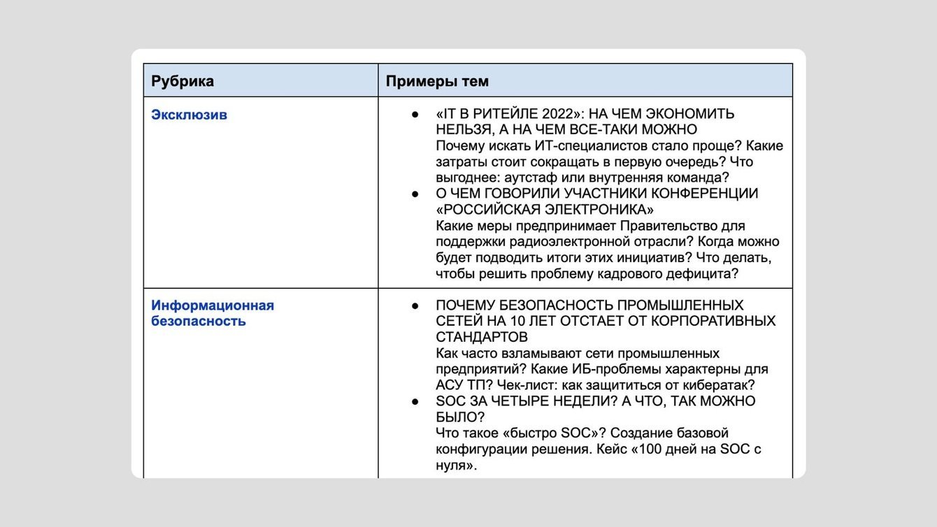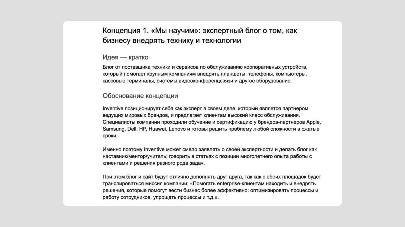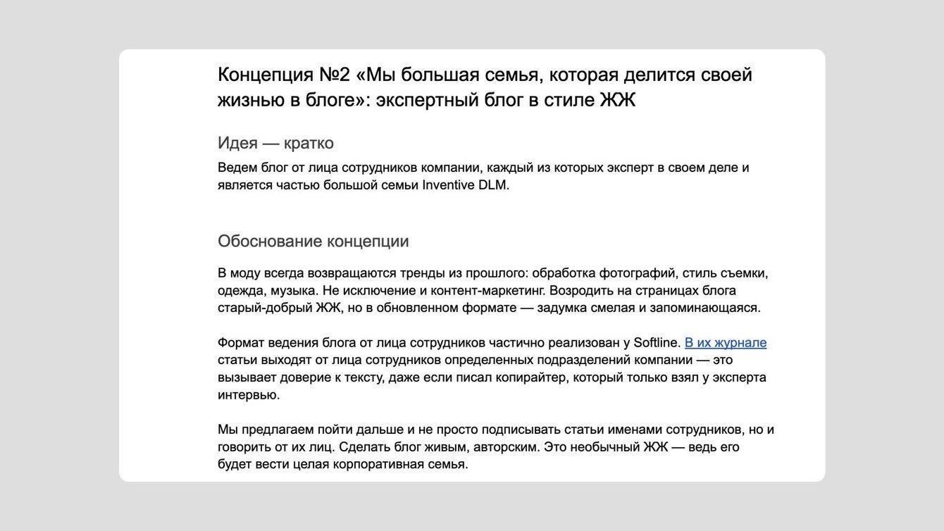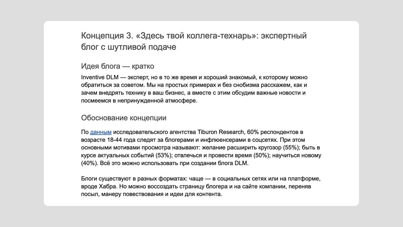 Получился документ на 34 страницы. Предложили клиенту три варианта концепции блога. Каждый подробно расписали: показали идею и обосновали ее, определили целевую аудиторию, рассказали о полезном действии блога, показали разделы и рубрики с примерами тем. Все три концепции принципиально отличались друг от друга.