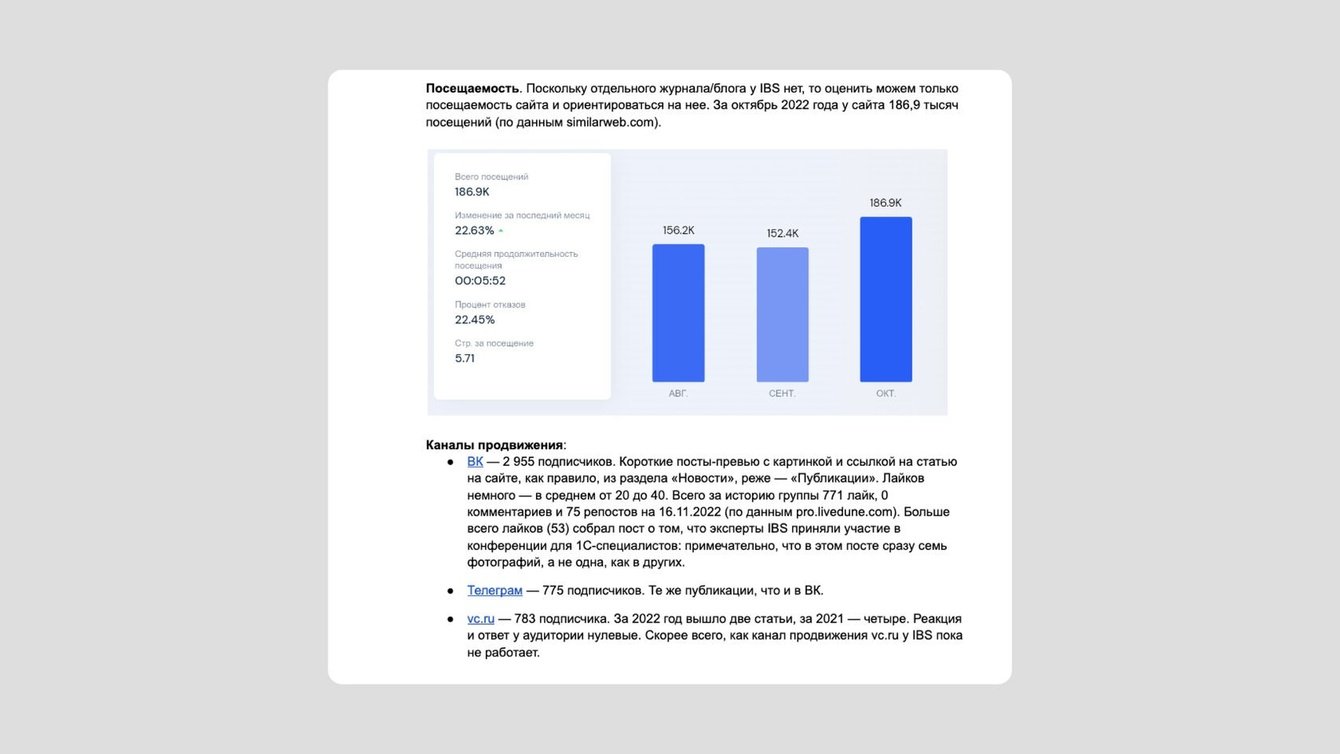 Разработали для клиента контент-стратегию и отдали документ на 109 страниц, где собрали информацию о конкурентах, продвижении в соцсетях, концепцию и контент-план на первый месяц. Сделали сайт с блогом и запустили соцсети.