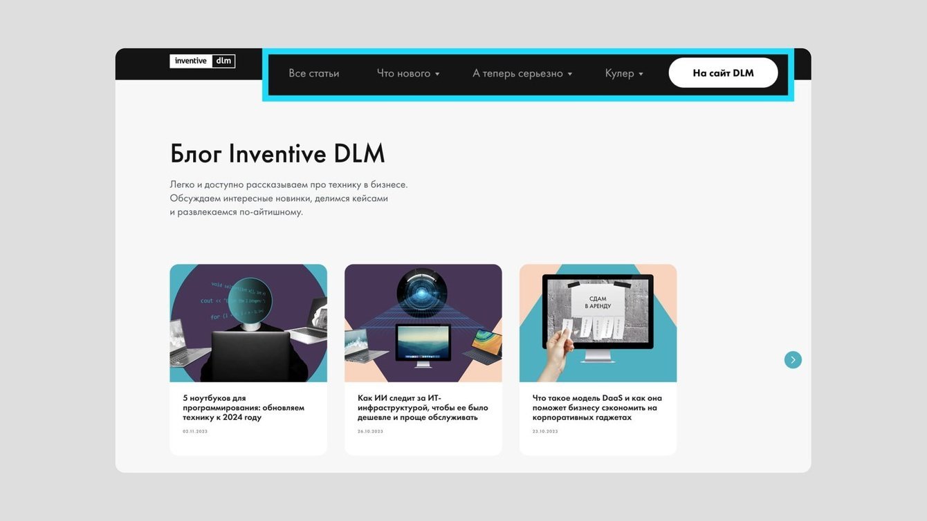 Inventive DLM пришла к нам в редакцию за контент-стратегией. В компании хотели сделать тематический блог для своих клиентов, которые интересуются технологиями. Нам нужно было придумать такую концепцию, которая бы показала экспертность бренда и повысила лояльность его клиентов.