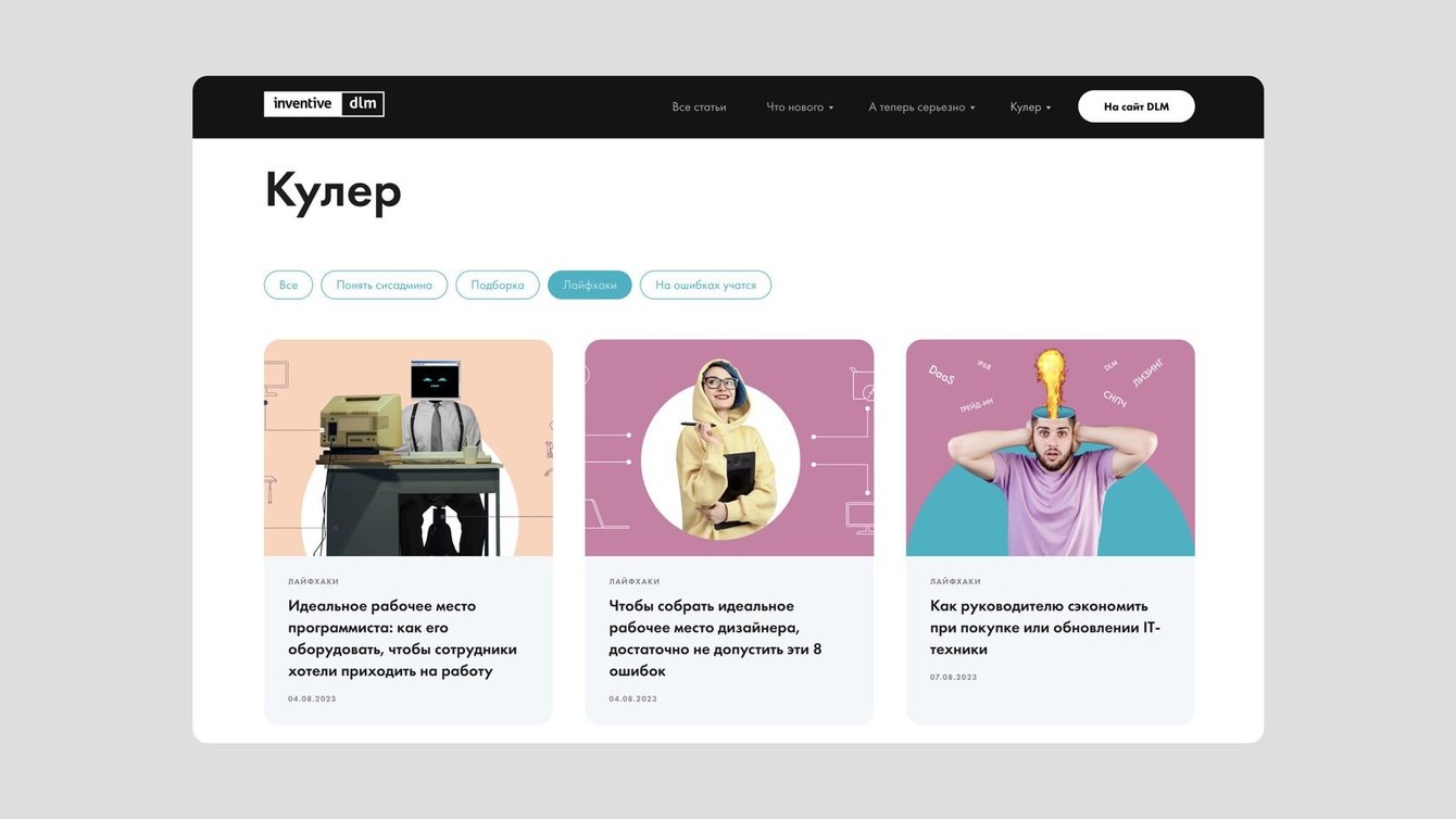 Inventive DLM пришла к нам в редакцию за контент-стратегией. В компании хотели сделать тематический блог для своих клиентов, которые интересуются технологиями. Нам нужно было придумать такую концепцию, которая бы показала экспертность бренда и повысила лояльность его клиентов.