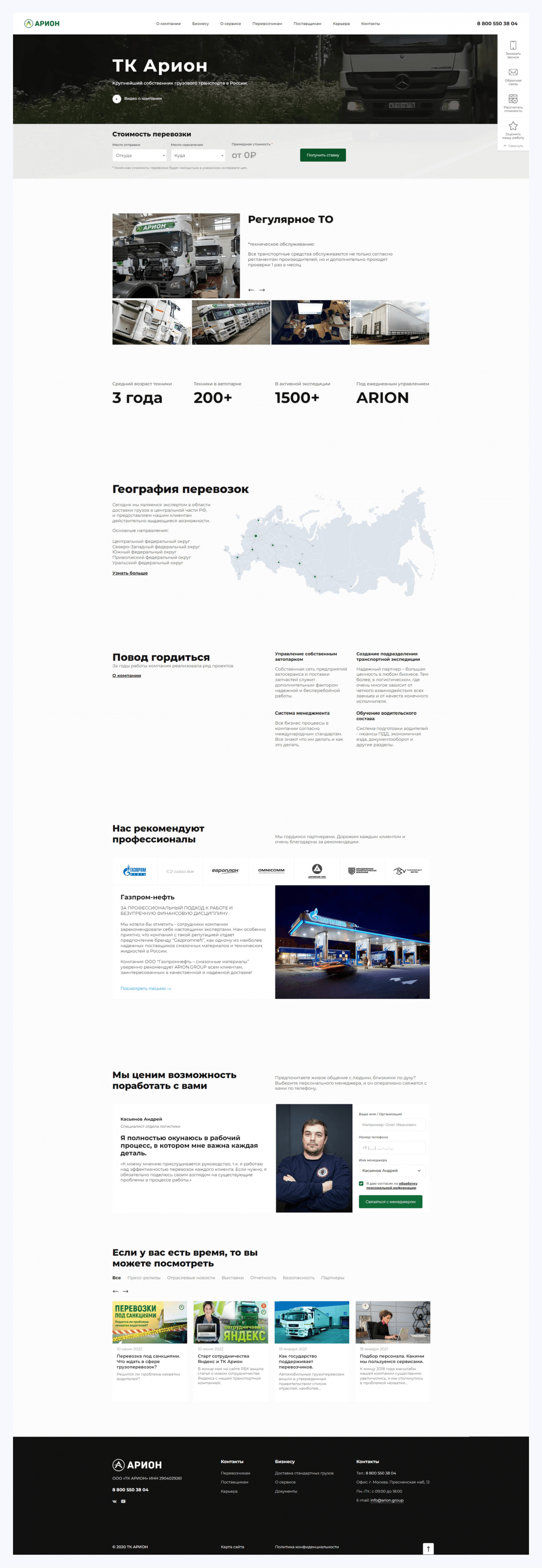 На главной странице сайта все работает на цель привлечения клиента: тут есть калькулятор стоимости перевозки, форма для связи, всевозможные виды контактов, краткая информация о компании и её достижениях. Всё самое важное вынесено в первый экран. Детальная информация по условиям сотрудничества для клиентов, поставщиков или соискателей расположена в отдельных разделах. Особо внимательные читатели найдут на сайте фото команды, описание миссии и принципов компании, отзывы клиентов и прочую полезную информацию, которая поможет принять решение о сотрудничестве. Проект был успешно реализован за три месяца.