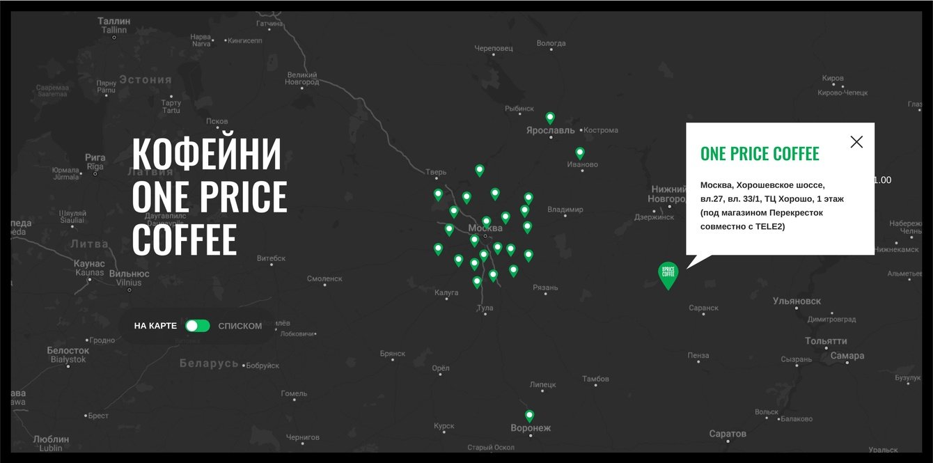 Поскольку общее число кофеен превышает 340 точек, мы разработали удобные форматы их отображения и навигации: