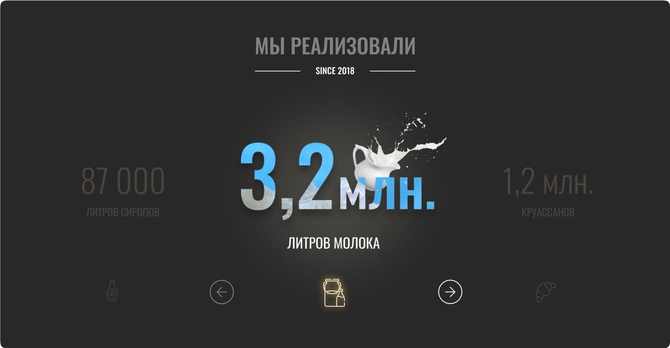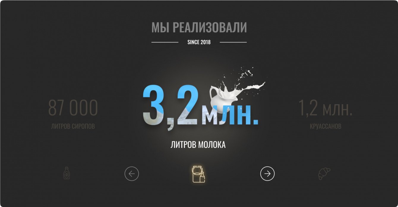 В блоке с показателями мы отображаем, сколько тонн кофе, литров молока и сиропа, круассанов и стаканчиков кофе было продано за всё время.