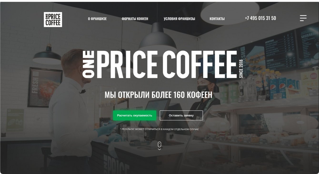 Разработали сайт сети кофеен с креативными анимациями и дизайном в фирменном стиле One Price Coffee, целью которого являлось привлечение заявок на продажу франшиз.