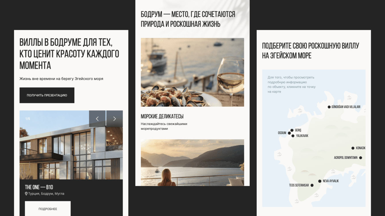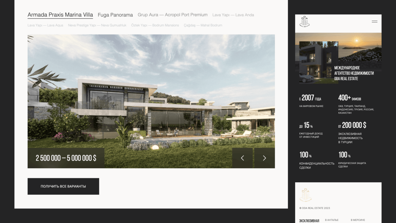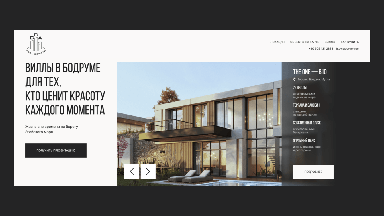 Показывая образ жизни на полуострове и преимущества сотрудничества с DDA Real Estate, сайт должен продемонстрировать потенциальным клиентам преимущества покупки виллы в Бодруме и объекты в продаже, предоставить исчерпывающую информацию о способах ее приобретения и собрать заявки на покупку недвижимости. При этом быть компактным и лаконичным.