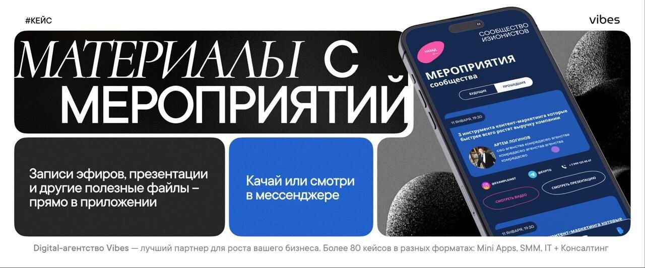 Даже если участник пропустил интересное событие, у него всегда есть доступ ко всем материалам встречи в приложении. Достаточно открыть вкладку с прошедшими мероприятиями и перейти на страницу конкретного ивента. На странице находятся запись эфира, презентации и другие файлы с возможностью скачивания или просмотра прямо в мессенджере.