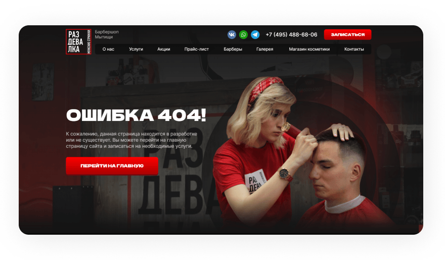 Не обошлось и без разработки страницы ошибки 404. Не забываем и здесь покреативить, дополнив визуалом под фирстиль компании. А также с нее удобно перейти в меню или на главную страницу.