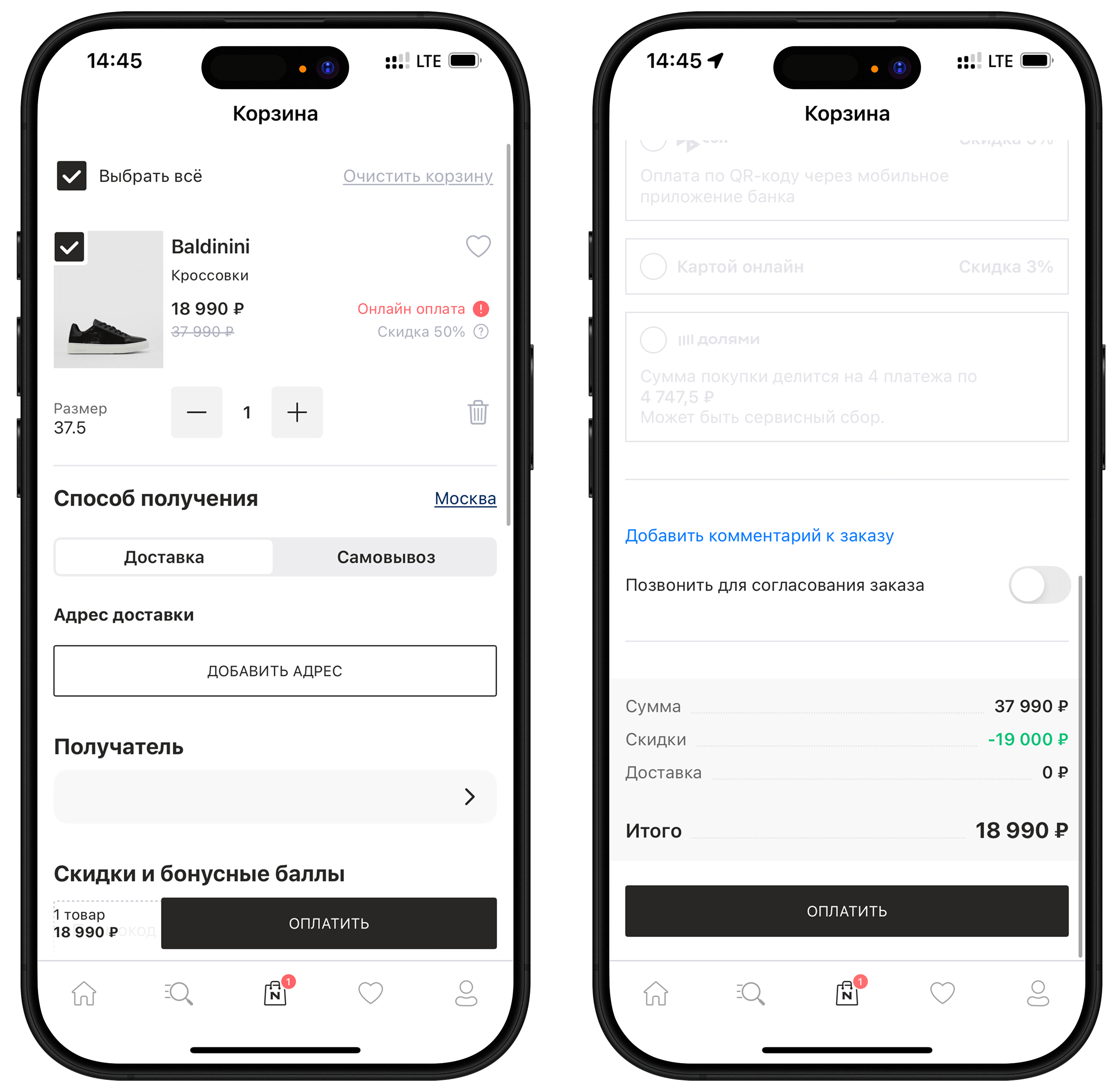 В приложении предоставлена возможность для быстрого оформления заказа с разными вариантами оплаты. Корзина одностраничная и все необходимые для завершения заказа поля представлены на одной странице, что удобно для пользователя.