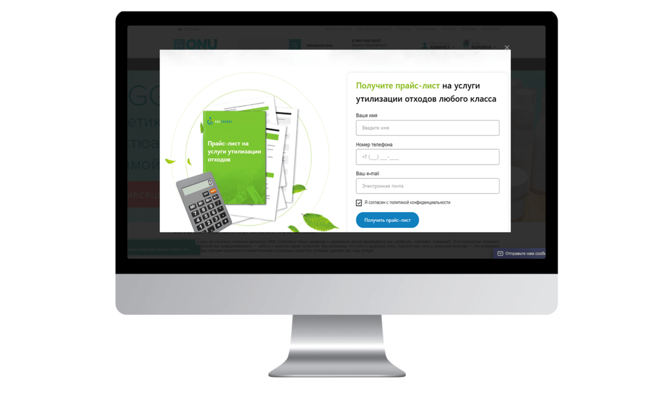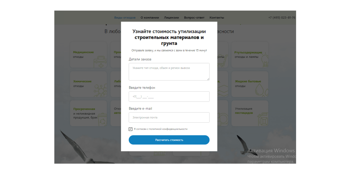 Самой конверсионной формой лендинга стала стандартная форма «Узнать стоимость», где пользователю предлагалось выбрать необходимый для утилизации отход, ввести объемы и регион вывоза, и получить расчет стоимости в течение 15 минут. Именно данная форма принесла более 80% всех заявок.