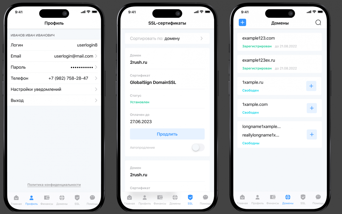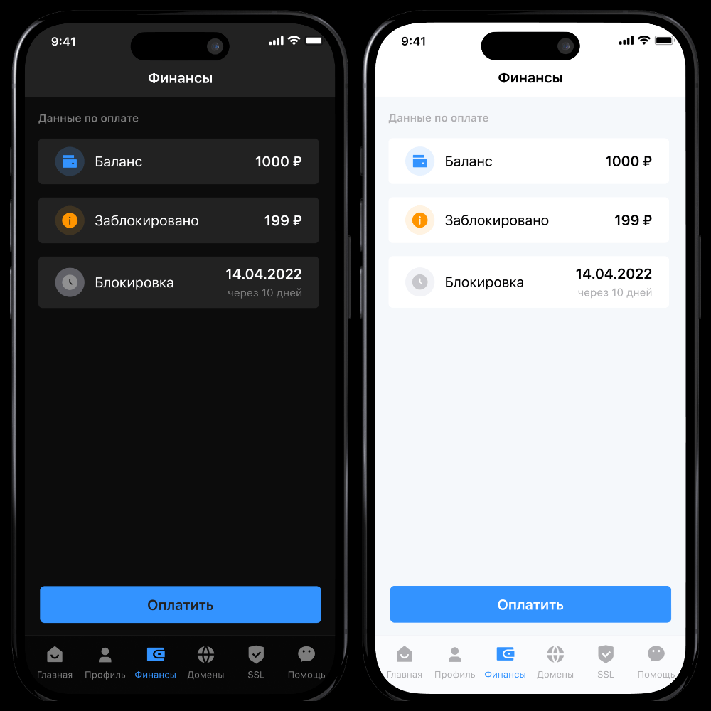 - управление финансами — просмотр баланса и количества доменных бонусов, настройка автоплатежа, пополнение баланса.