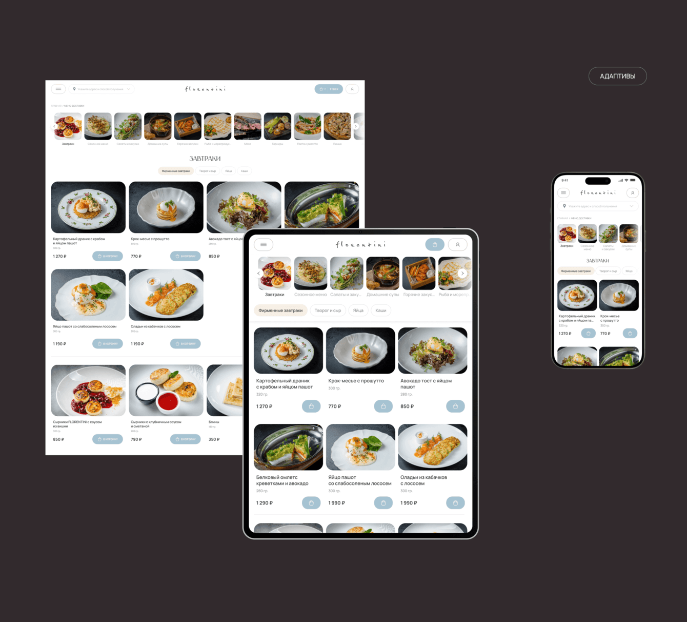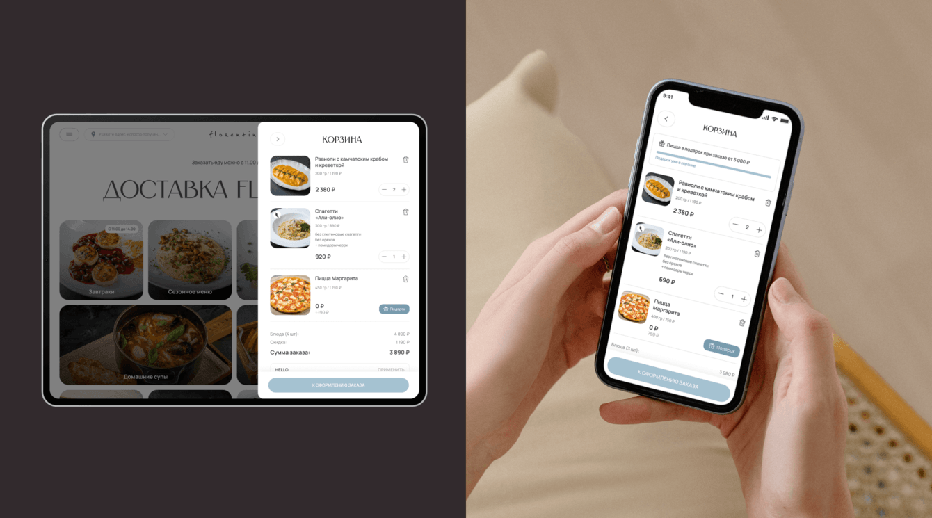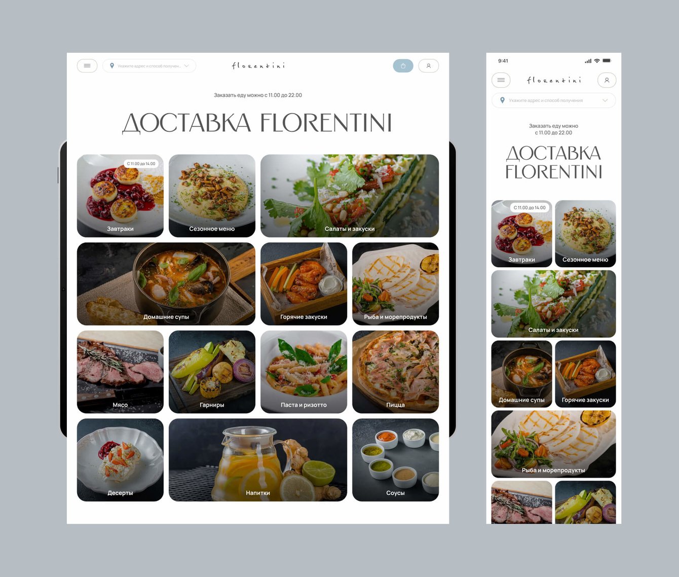 Мы сделали новую информационную архитектуру и нарисовали современный и легкий дизайн для сервиса доставки Florentini. Новый сайт стал удобным для использования на разных мобильных устройствах. Это было одной из основных задач от заказчика.