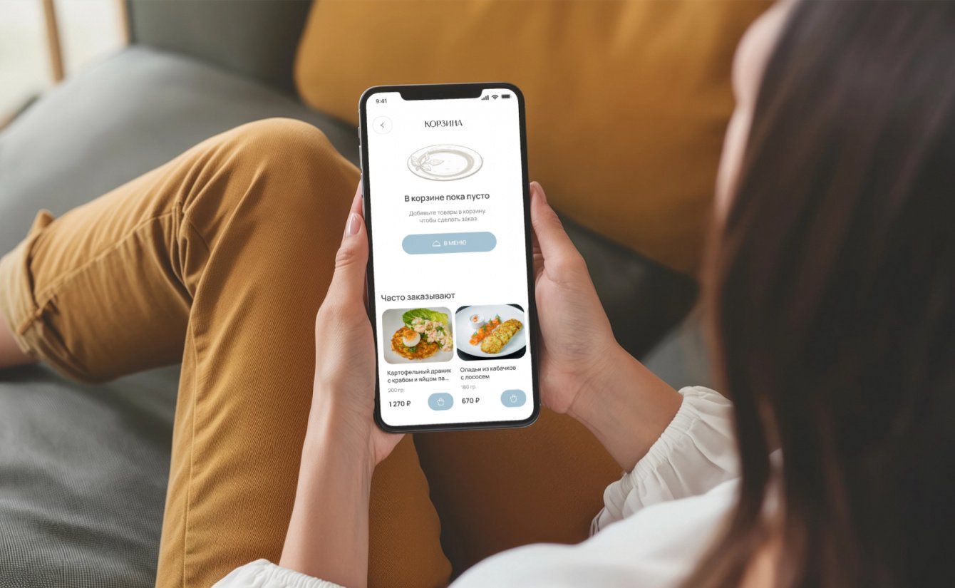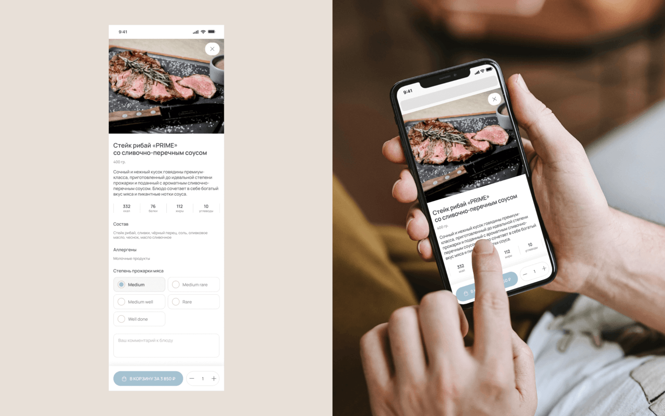 Мы провели большую работу над и детализацией карточки товара. Проектировали карточку товара так, чтобы фотография блюда, описание и возможность добавить в корзину были всегда на виду в десктопе, а в мобильной версии кнопка добавления товара была закреплена в нижней части экрана.