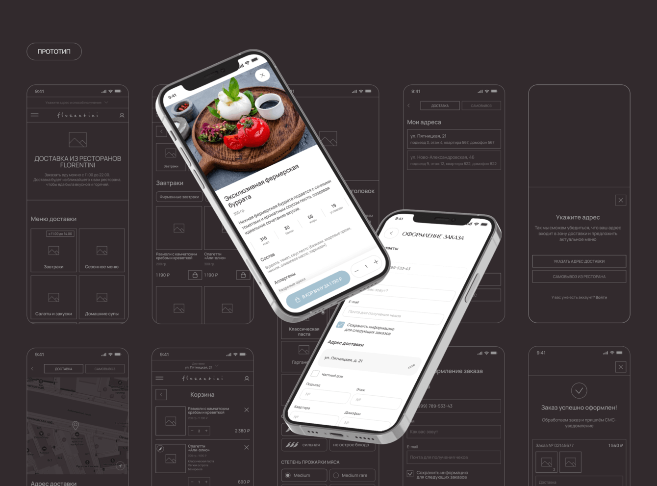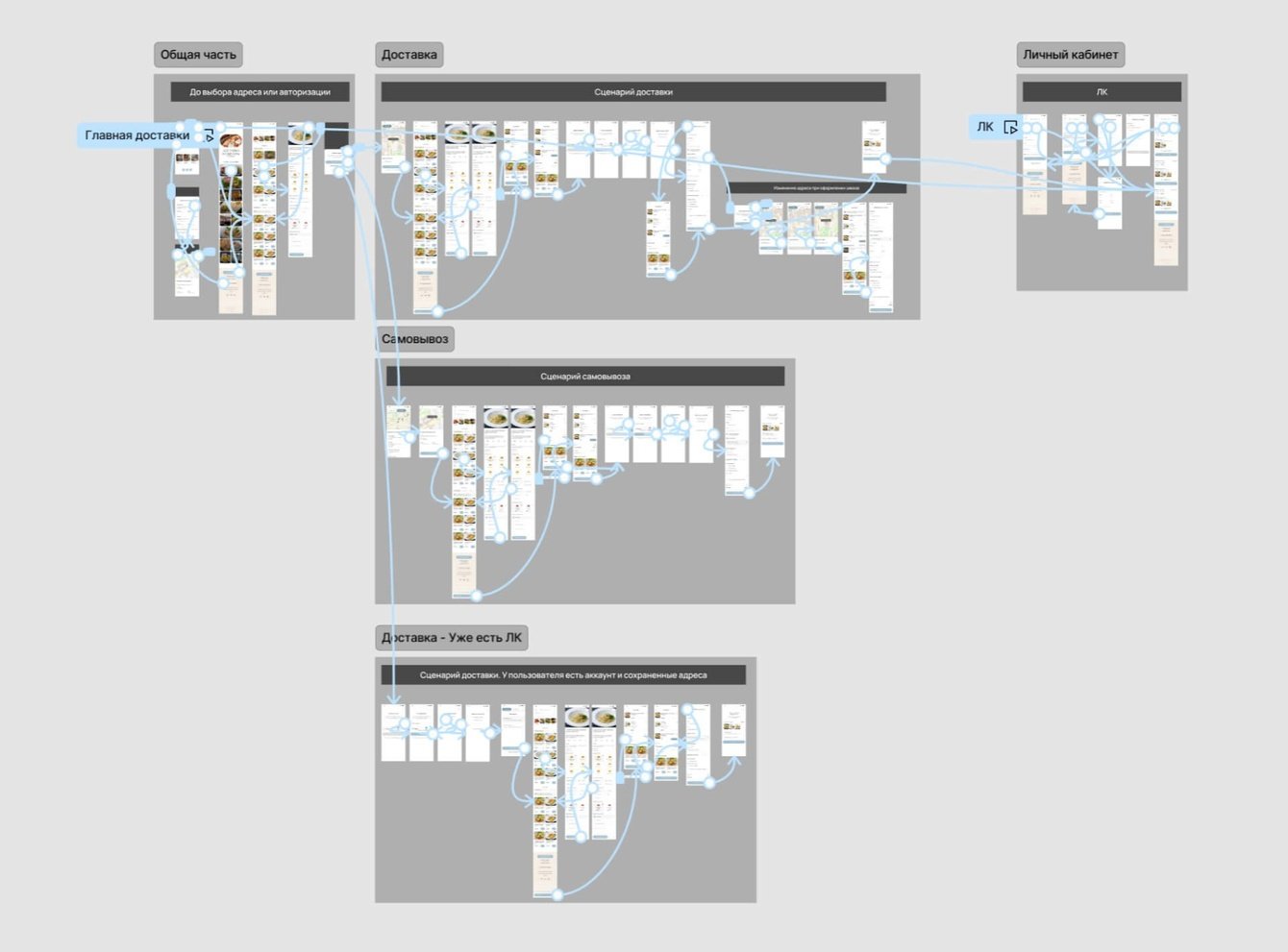Распределили прототипы по разным сценариям использования сервиса. Начали с первого касания пользователей с сайтом и продолжили сценариями доставки, самовывоза и взаимодействия с личным кабинетом.