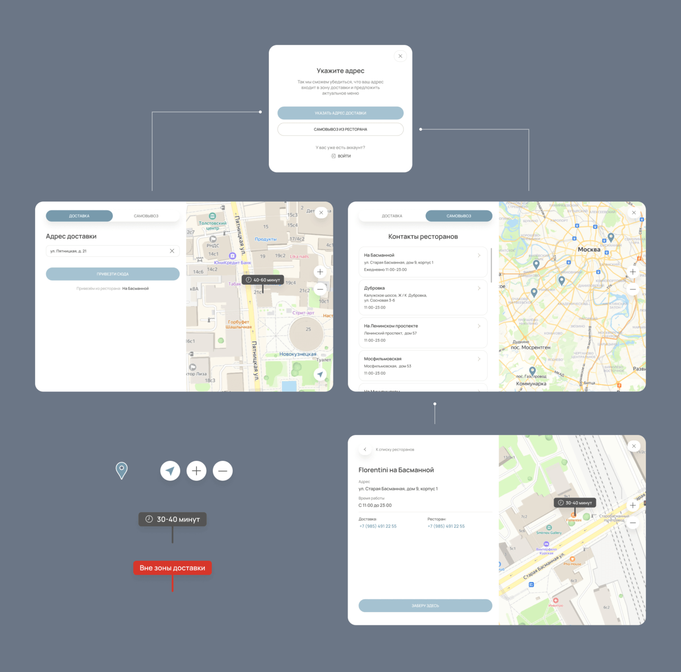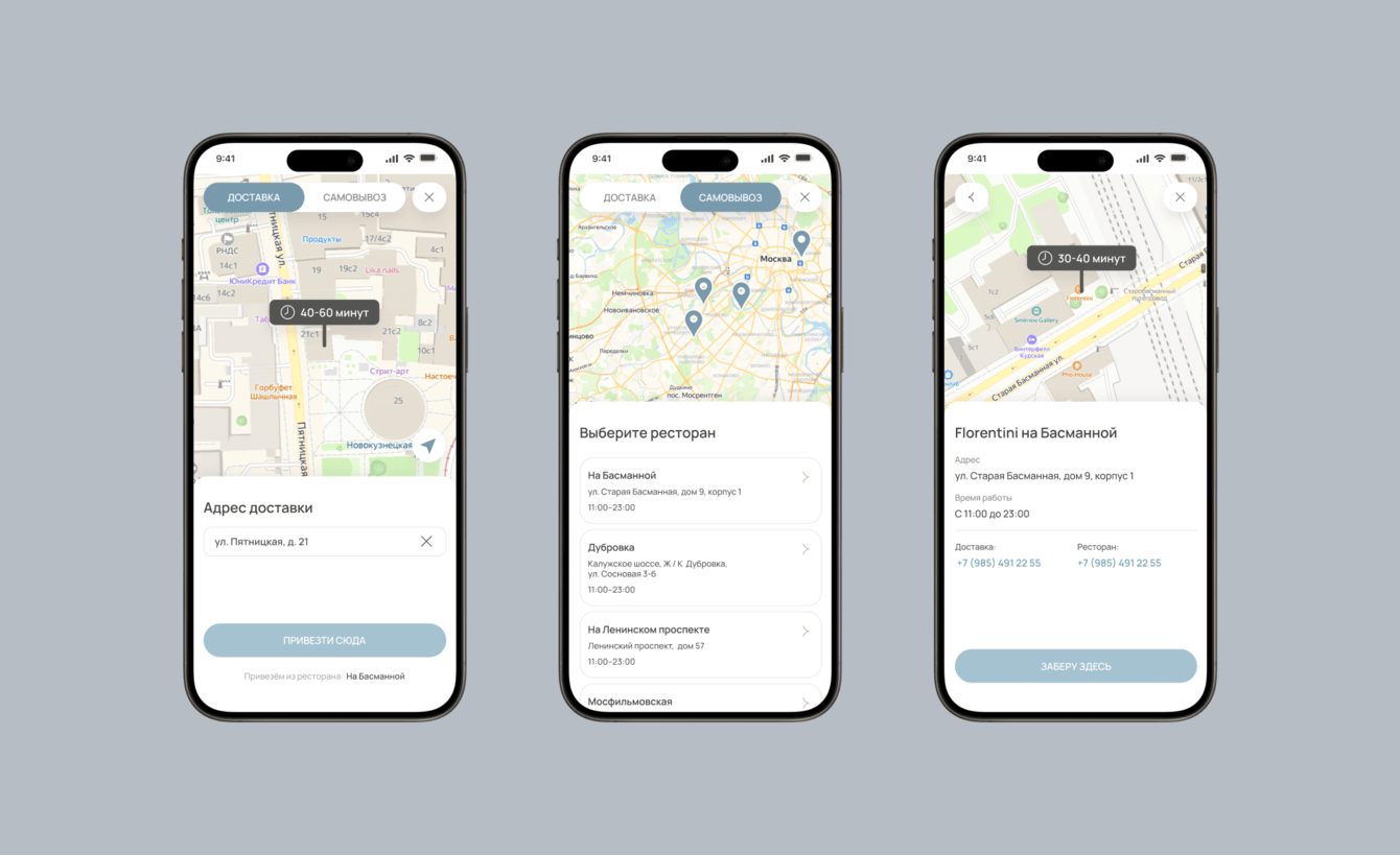 Мы реализовали механику выбора доставки или самовывоза. Теперь пользователи могут посмотреть на карте ближайший ресторан, узнать его контакты и оформить заказ.