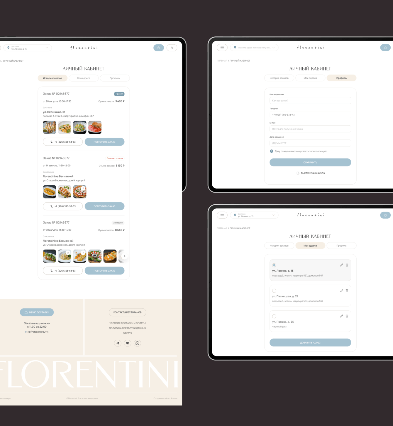 У ресторанов Флорентини много клиентов, которые заказывают еду. При первом взаимодействии с сайтом, для покупателя создается личный кабинет, который привязывается к его номеру телефона.