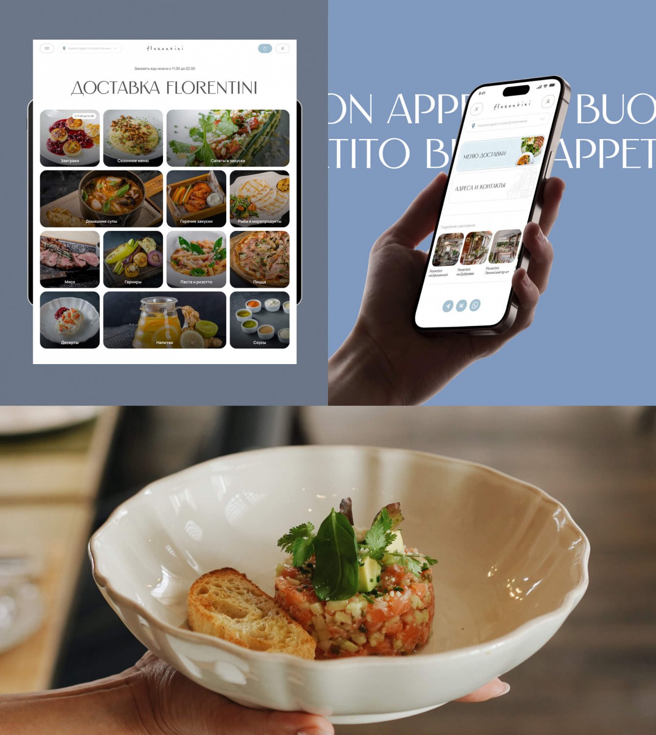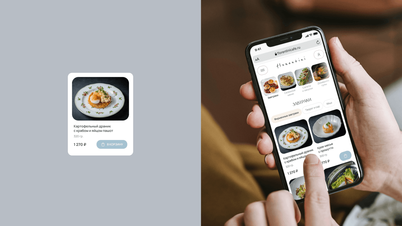 Чтобы подчеркнуть изысканную итальянскую кухню в исполнении Флорентини, мы предложили для всех заголовков декоративный, изящный, но хорошо читабельный шрифт Angst. Для остального текстового контента выбрали устойчивый Manrope, чтобы не затруднять чтение важной информации.
