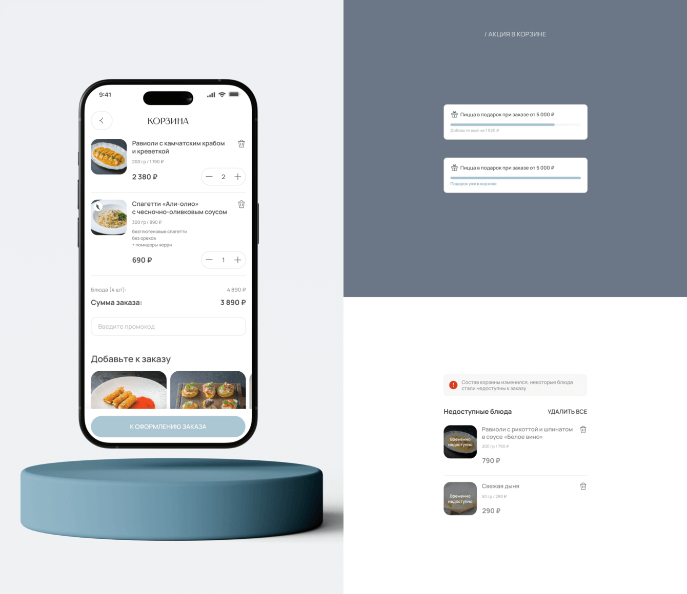 В корзине также можно найти акции, которые предлагает Флорентини для покупателей, а также информацию, какие блюда стали недоступны с момента добавления и до момента оформления заказа.