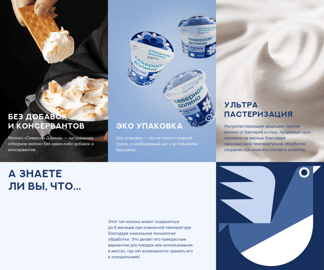 Проект предлагает для молочной категории нетипичный цифровой формат: здесь фокус сделан на визуальное восприятие бренда. Вместо сайта-каталога по модели интернет-магазина мы сделали презентационный бренд-сайт, который работает как продолжение упаковки и айдентики.Такой же формат могут использовать другие FMCG-компании как базовый стандарт брендовой цифровой коммуникации.