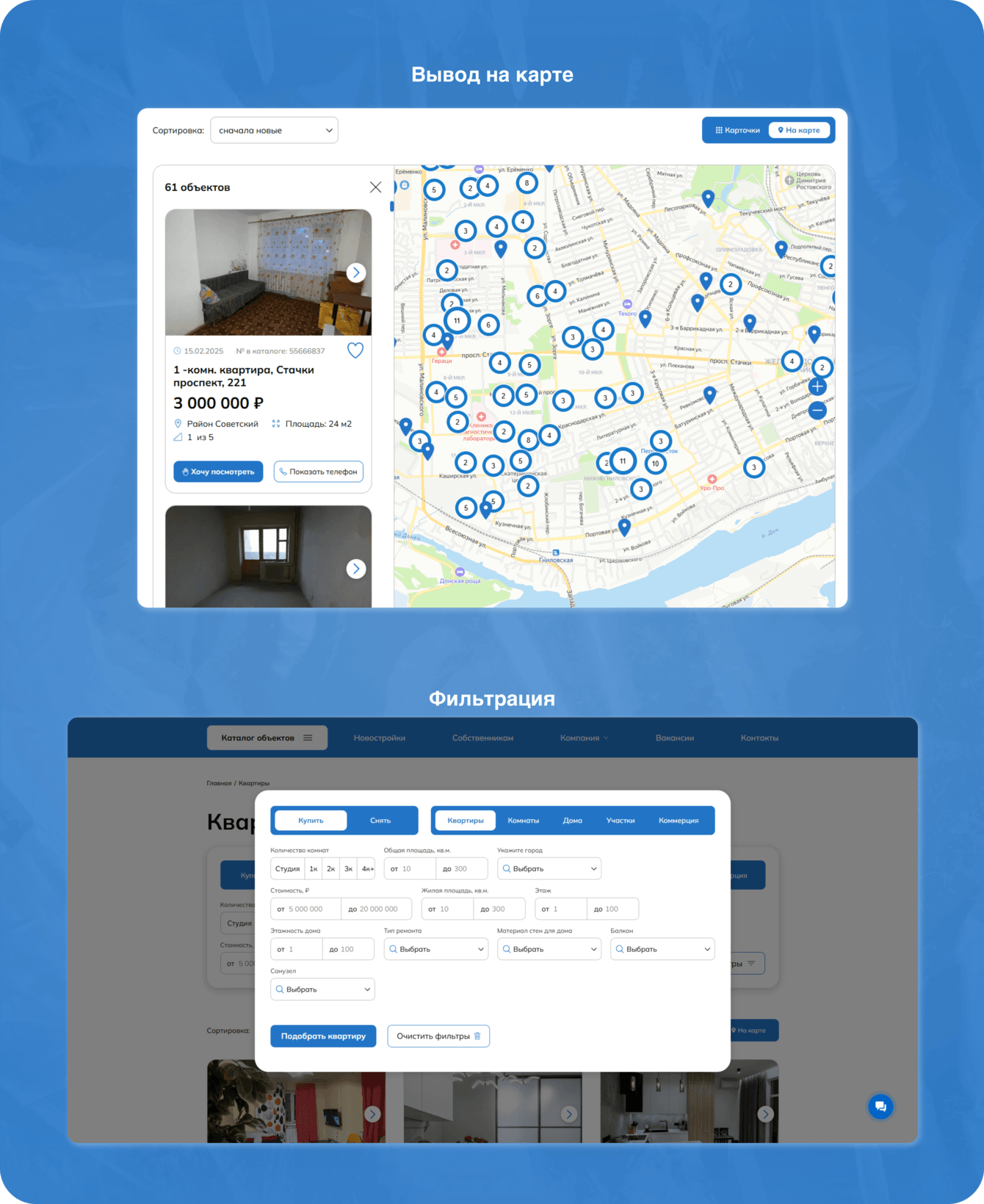Фильтрация: у каждого типа недвижимости были свои параметры поиска. Фильтры работали без перезагрузки страницы, что ускоряло процесс выбора объектов.