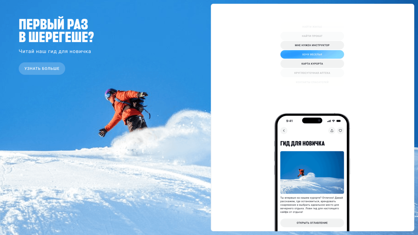 — Блоки «Гид для новичка», «Подъемники», «Камеры», «Афиша», «Где потусить», «Детские комнаты», «Просторы Шерегеша» и другие.