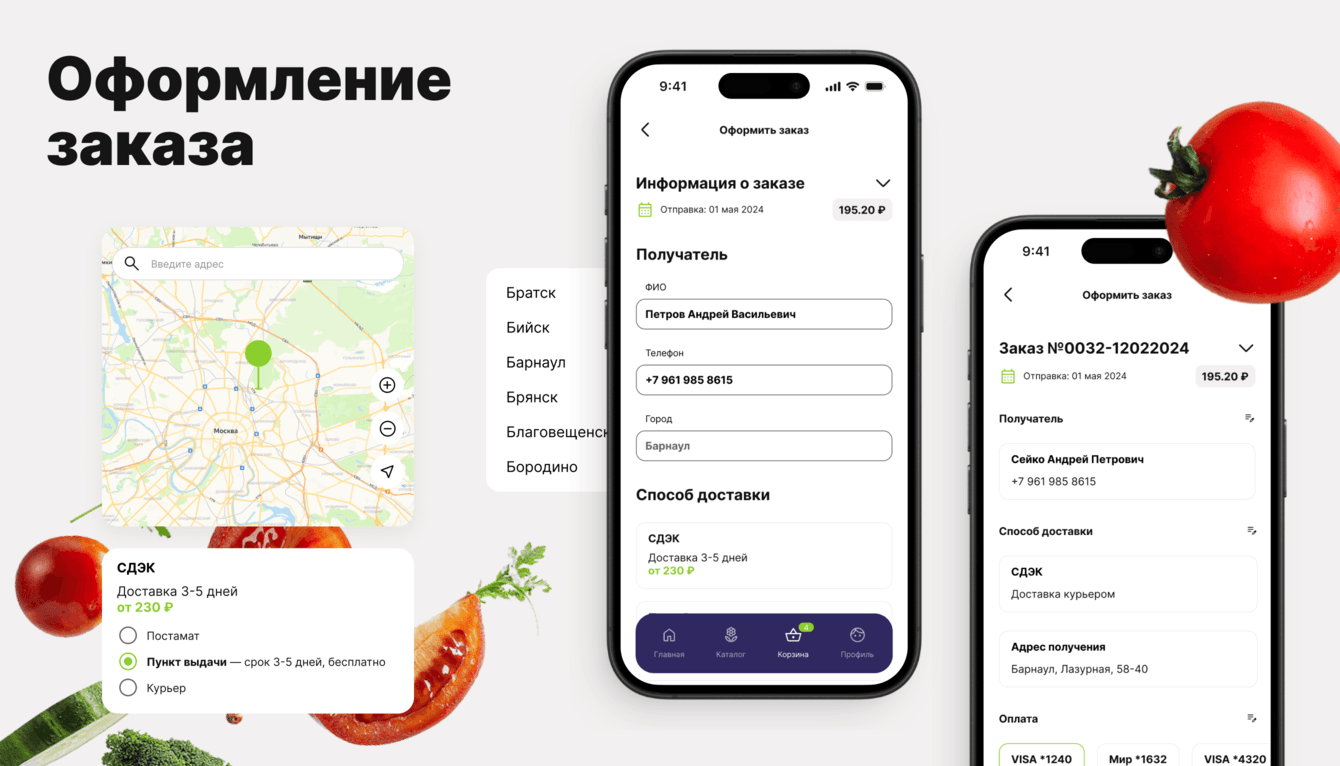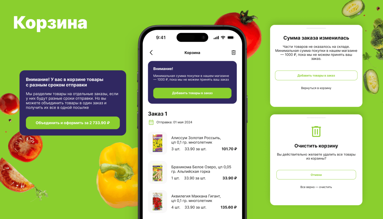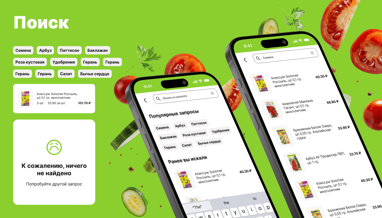 Мы учли, что большая часть возрастной аудитории пользуется интернетом не так уверенно, как их дети. Поэтому сделали функционал приложения проще, оно позволяет оформить заказ на любой адрес доставки или выбрать удобный пункт выдачи. Клиент может заказать семена и саженцы для себя или своих родственников, указав их адрес или пункт получения.
