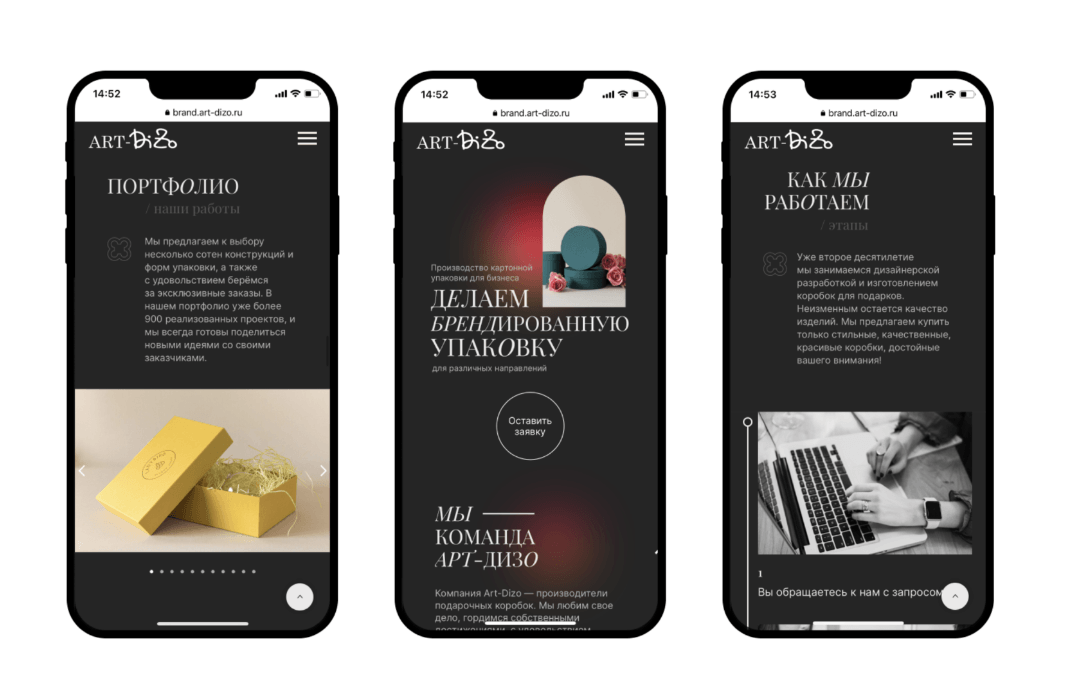 Для своих изделий компания нередко организовывает фотосессии, т.к. эффектная презентация продукта повышает интерес потенциальных клиентов к портфолио. Предоставленные фотографии в первую очередь продиктовали визуальный язык лендинга в целом, и, как следствие, органично вписались в каждый блок.