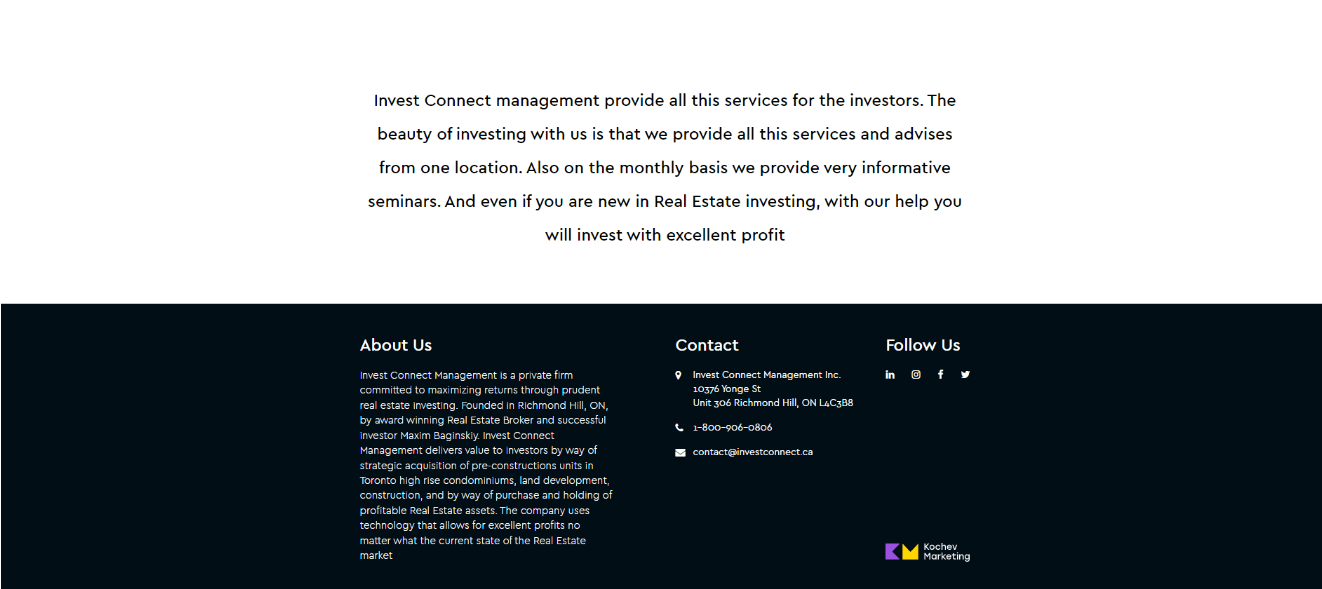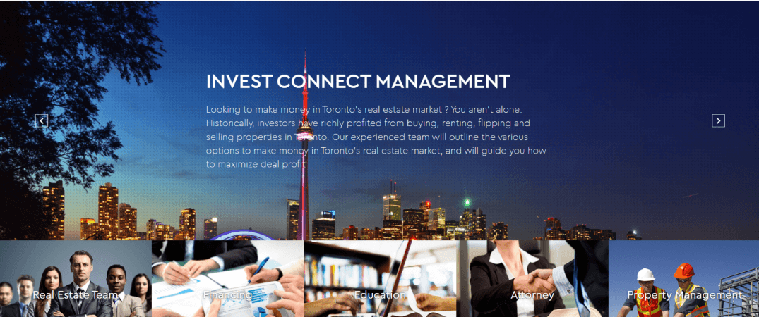Invest Connect Management — это бутик-фирма, основанная на проверенном опыте и четкой инвестиционной стратегии. Наша опытная команда заботится о потребностях инвесторов, а наши штатные ипотечные брокеры, юристы и бухгалтеры заботятся о наших клиентах.