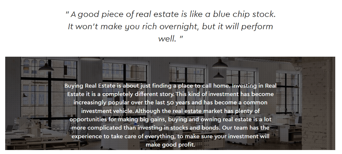 Платформа содержит полную информацию об услугах компании, включая руководство по инвестированию в недвижимость с описанием шести ключевых аспектов и преимуществами профессионального сопровождения.