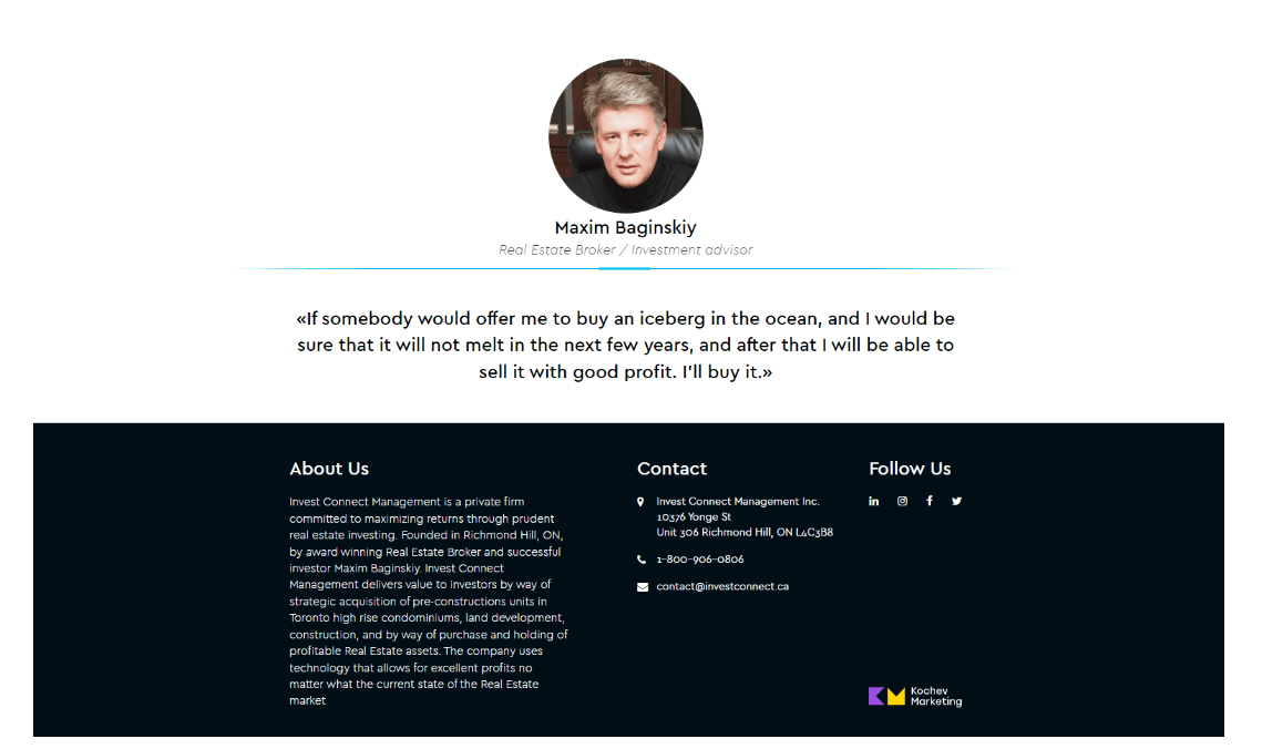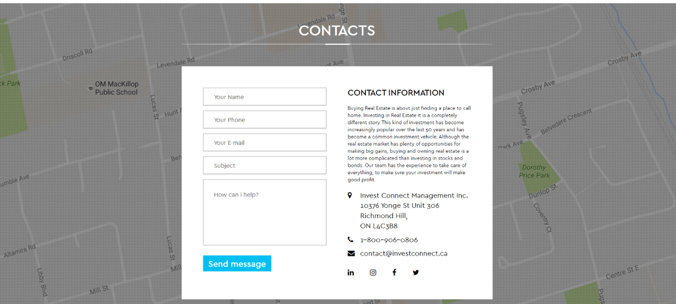 Страницу Контакты сделали максимально локоничной и удобной для пользователя. Есть все необходимое, чтобы связаться с фирмой INVEST CONNECT MANAGEMENT и начать сотрудничество.