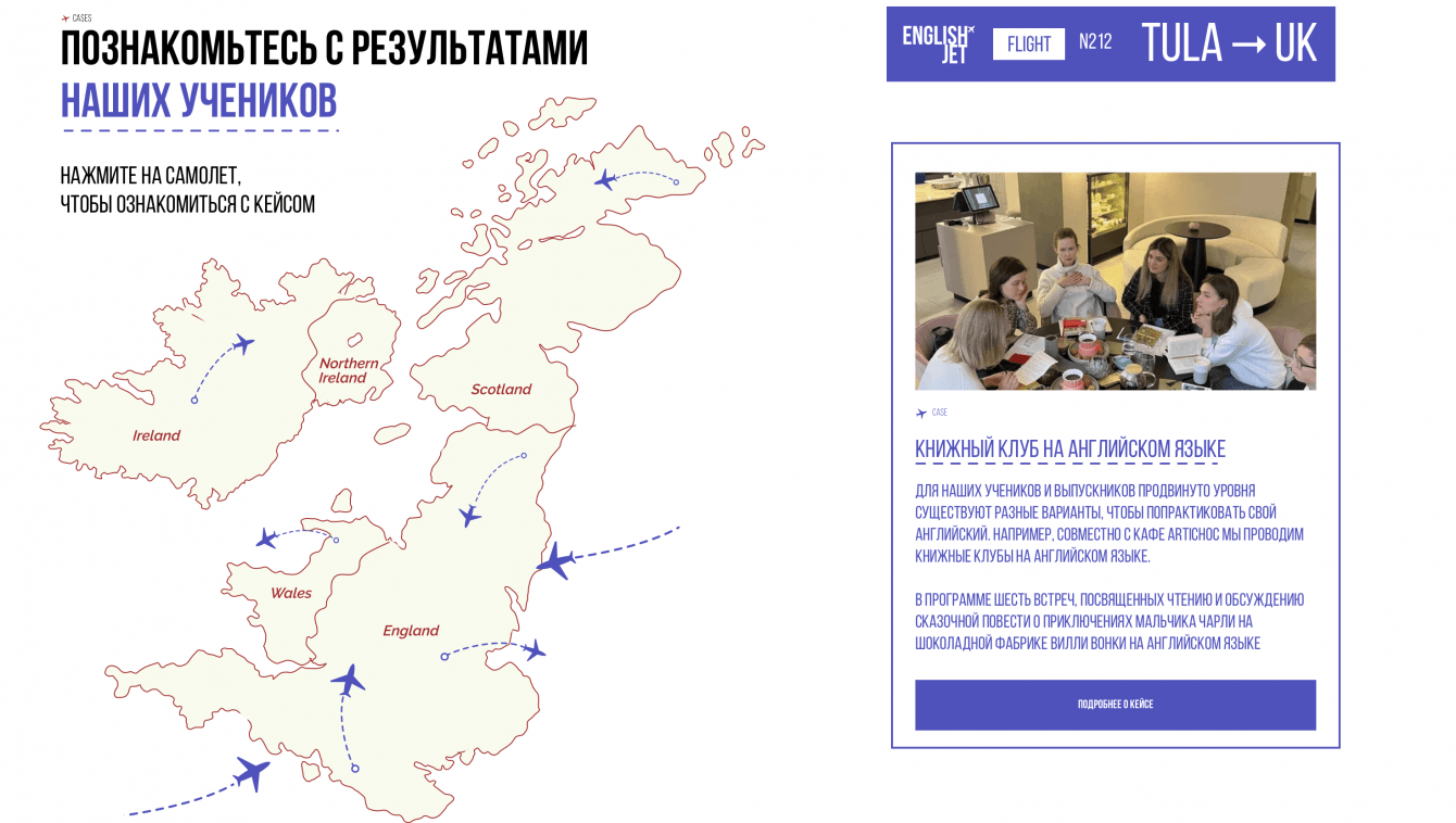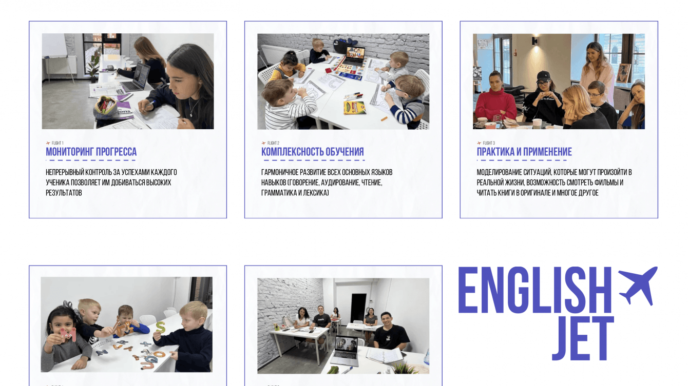 Первым делом мы провели аудит предыдущего сайта, чтобы найти проблемы . Причиной стали устаревший бренд, который перестал быть близок целевой аудитории и не отражал всех преимуществ школы. Прежде чем браться за обновление сайта, мы вместе с клиентом изучили прямых конкурентов — выделили сильные и слабые стороны. Такими являлись: устаревший дизайн, огромные перенасыщенные ненужной информацией и абсолютно неудобные для использования сайты. В нашей компетенции важно было сделать так, чтобы посетителю было максимально комфортно. EnglishJet предоставляет услуги курсов настоящих профессионалов. Поэтому основной акцент мы сделали на оффлайн обучение и упаковки самых интересных кейсов школы. Далее мы занялись построением прототипа и структуры сайта. EnglishJet предоставляет услуги курсов настоящих профессионалов. Поэтому основной акцент мы сделали на оффлайн обучение. Прототип нужен для того, чтобы понять как расположить элементы на странице и продумать сценарий действий пользователя во всех разделах сайта. Правильное проектирование повышает конверсионность сайта. После согласования концепции дизайна, мы занялись переносом сайта в cms Tilda. Главным желанием по верстке сайта от заказчика было наличие анимаций, чтобы сайт был очень динамичным и эффектным