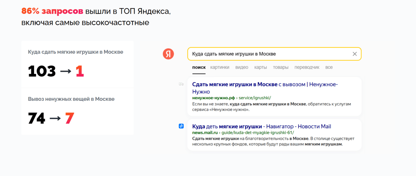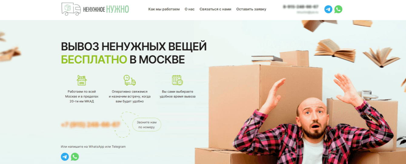 Ненужное нужно – сервис, занимающийся вывозом ненужных вещей в Москве с целью дальнейшей перепродажи, переработки и благотворительности. До работы с нами у клиента был сайт, который не приносил заявки.