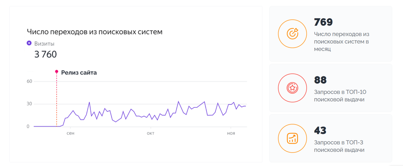 Подобрали 1000+ ключевых запросов по тематике клиента. Подключили системы аналитики для сбора статистики по посещаемости