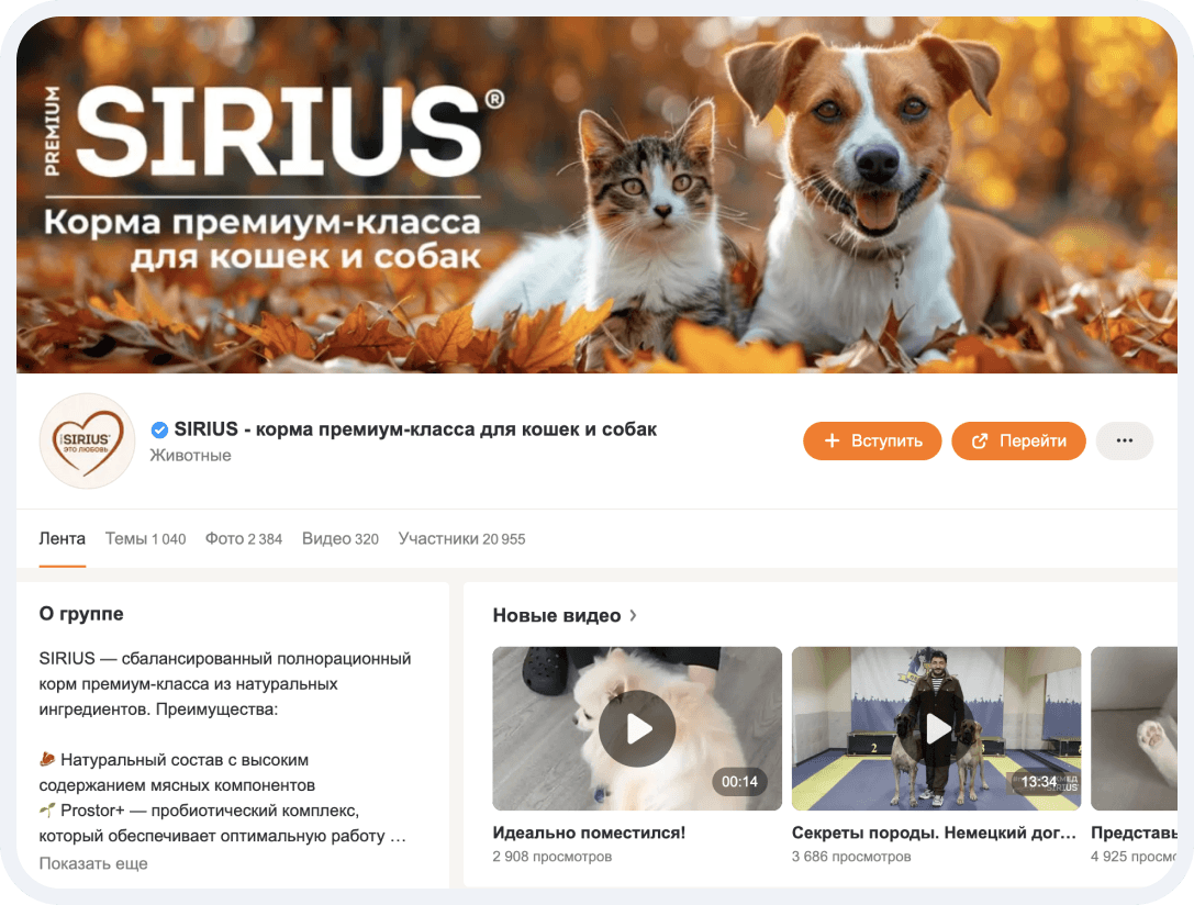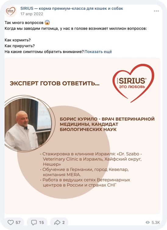 Профессиональный контент. Статьи от ветеринаров и специалистов, экспертные рекомендации по выбору кормов и уходу. Такой контент усиливал репутацию компании как профессионала в своей области и поддерживал имидж надёжного источника знаний.