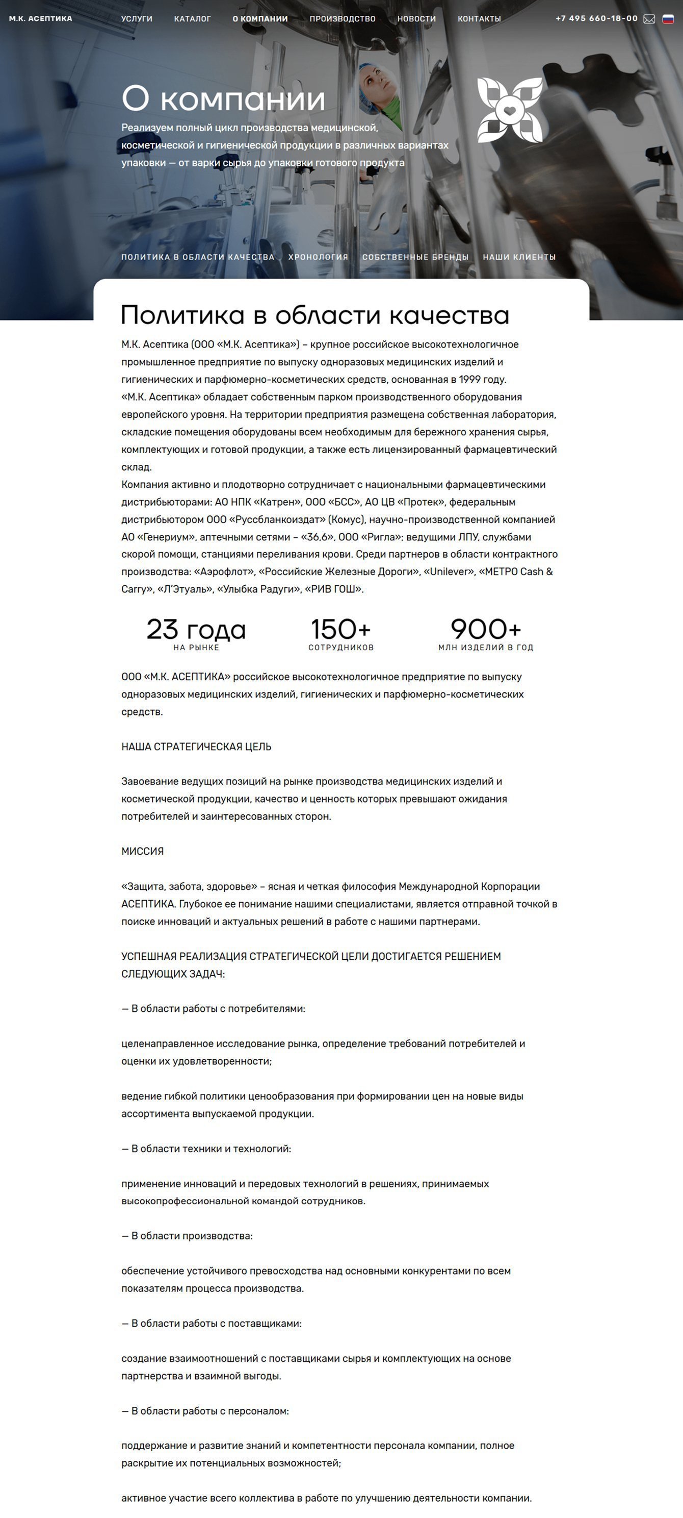 В данном разделе описана миссия и ценности компании, её многолетний опыт и амбиции в области контрактного производства медицинских и косметических средств.